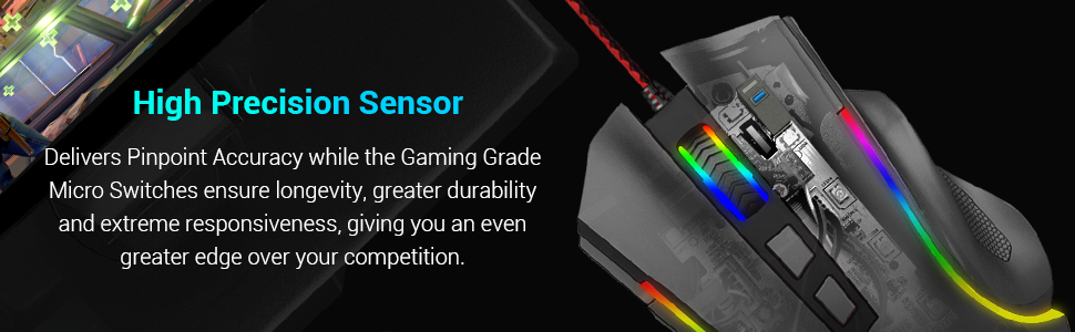 مستشعر عالي الدقة يوفر دقة بالغة بينما تضمن مفاتيح مايكرو بدرجة الألعاب طول العمر. متانة أعلى واستجابة قصوى، ما يمنحك الصدارة أمام منافسك.